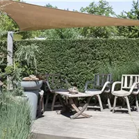 Im Frühjahr ist die Sonne noch angenehm warm, im Hochsommer aber sehnt man sich meist nach einem Schutz vor den brennenden, stechenden Strahlen. Die einfachste Lösung ist ein Sonnenschirm, der dort aufgestellt wird, wo Bedarf ist. Bei den klassischen Mittelstockschirmen (mit rundem oder quadratischem Schirm aus Polyestergewebe) kann der Fuß manchmal im Weg sein. Sehr praktisch sind deshalb Ampelschirme, bei denen der Fuß seitlich steht und der Schirm "schwebt". Achten Sie wegen der Standfestigkeit jedenfalls auf einen ausreichend dimensionierten Ständer oder eine Bodenhülse. Weitere Sonnenschutzmöglichkeiten ist eine fest installierte Markise oder ein Sonnensegel, das an drei bis vier Stellen befestigt wird.